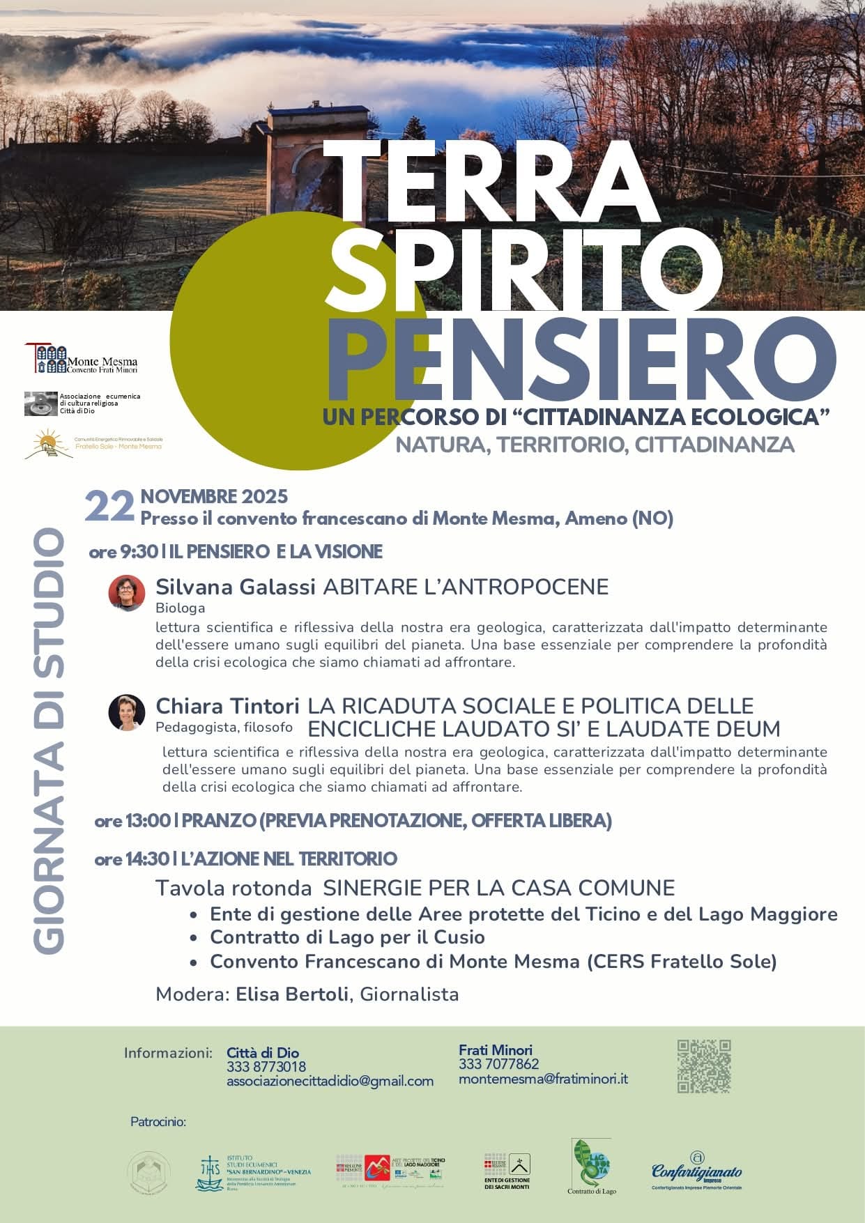 Sabato 22 novembre 2025, dalle ore 9:30, presso il convento francescano di Monte Mesma, ad Ameno (NO), si terrà la giornata di studio “Terra, Spirito, Pensiero – Un percorso di cittadinanza ecologica. Natura, territorio, cittadinanza”.