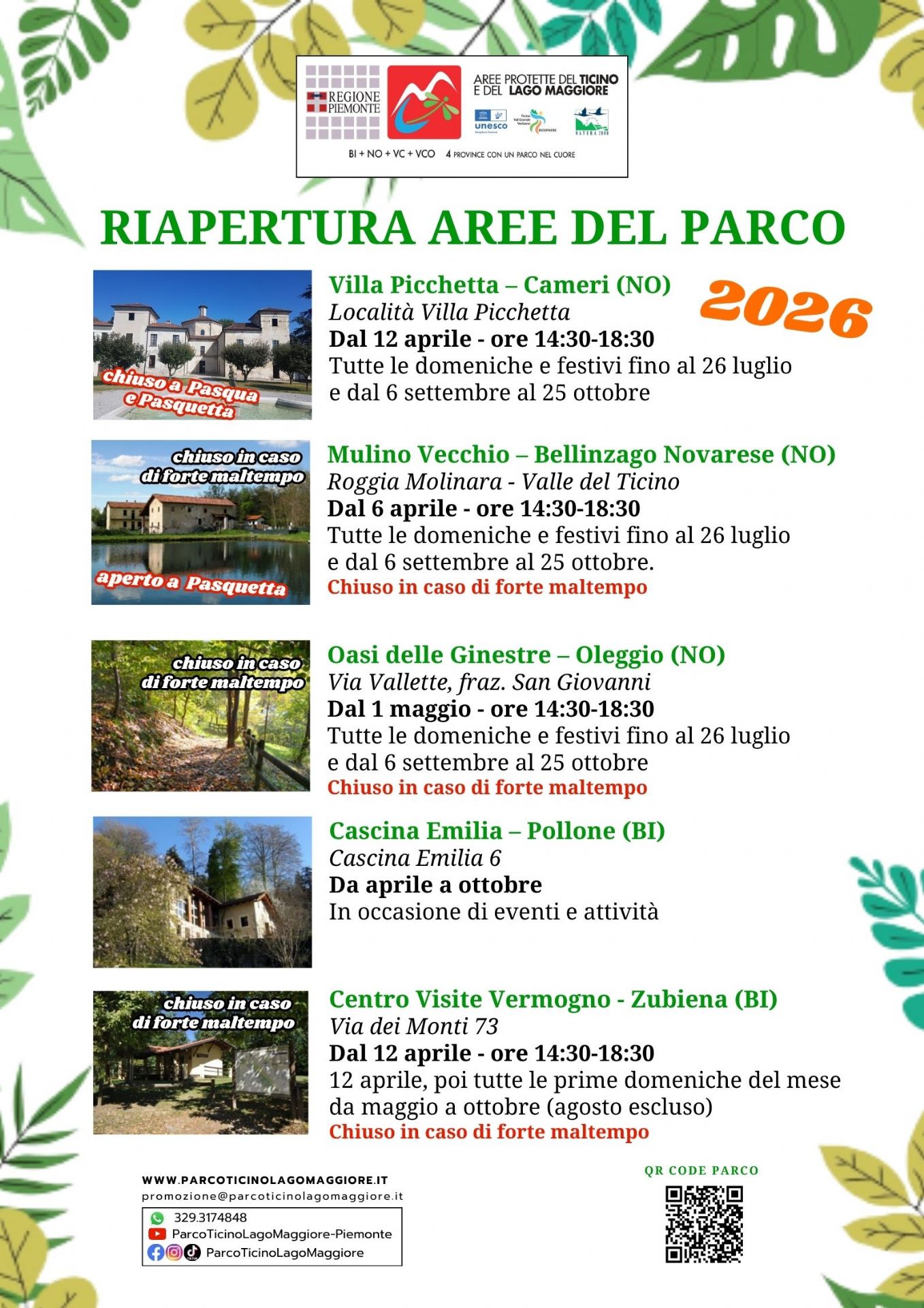 Il Mulino Vecchio di Bellinzago Novarese aprirà al pubblico lunedì 6 aprile, Villa Picchetta il 12 aprile, l’Oasi delle Ginestre a Oleggio il 1° maggio, Cascina Emilia nel Parco Burcina in occasione degli eventi e il Centro visite di Vermogno-Zubiena il 12 aprile.