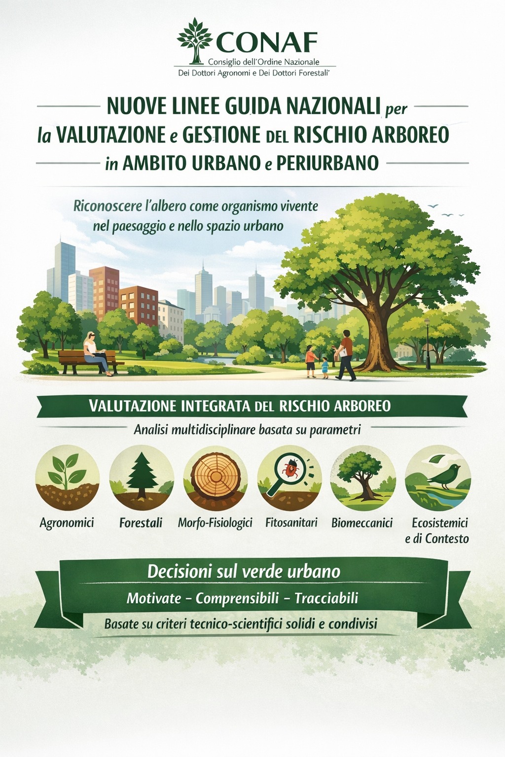 Il CONAF (Consiglio dell’Ordine Nazionale dei Dottori Agronomi e dei Dottori Forestali) ha pubblicato le nuove Linee guida nazionali per la valutazione e la gestione del rischio arboreo in ambito urbano e periurbano. Il documento adotta un approccio che riconosce l’albero come organismo vivente inserito nel paesaggio e nello spazio urbano, valorizzandone le funzioni ecologiche, sociali e culturali.